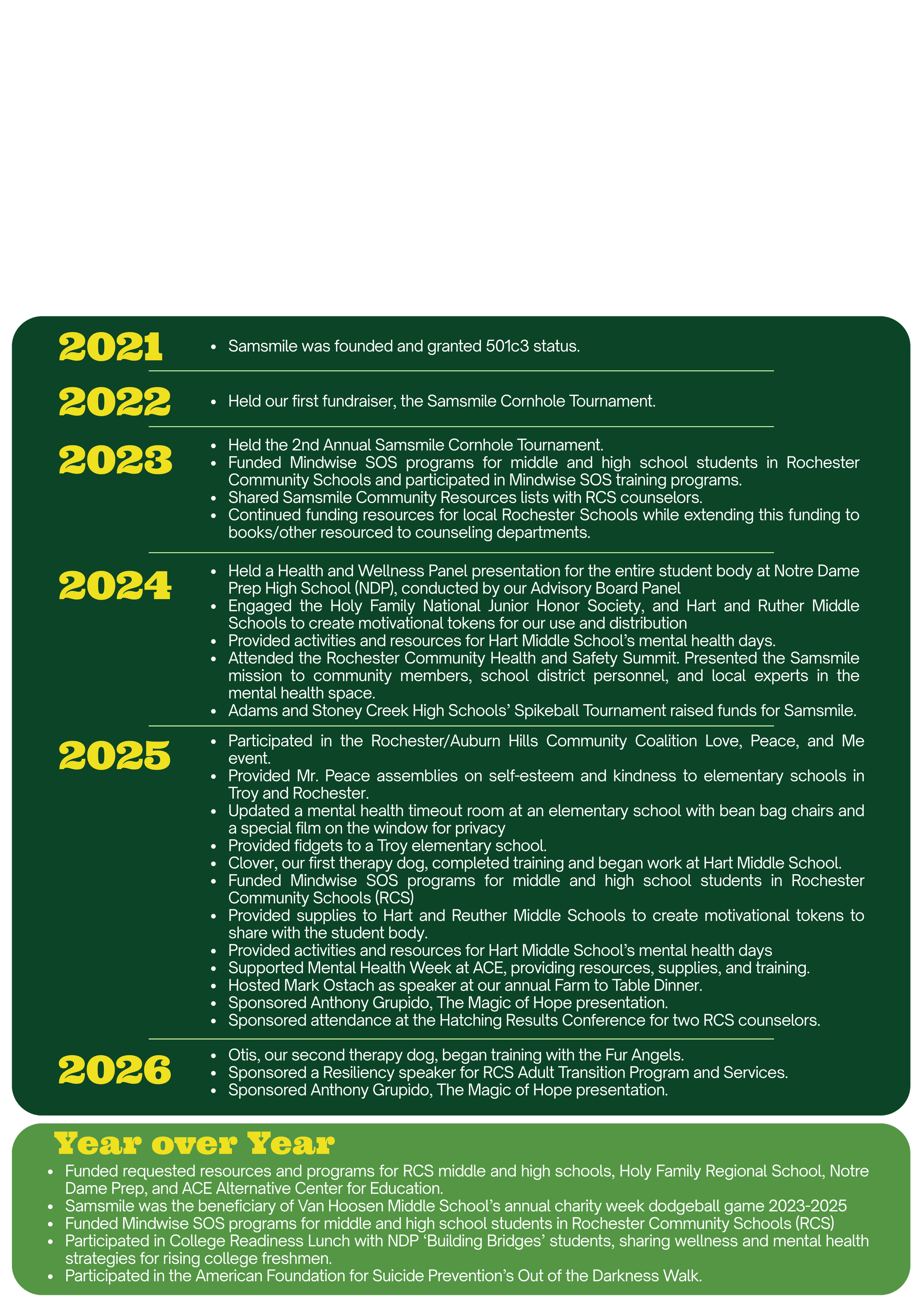 Samsmile is a registered 501 (c) (3) foundation. The mission of Samsmile is to support mental health advocacy, education, and suicide prevention in Rochester and throughout Oakland County. Our work supports essential services, provides programming, funds resources in local schools, and meets the needs of the larger community.